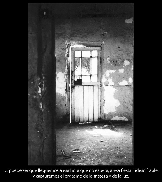 “Imágenes ancladas a mi silencio, a mi tristeza, a mi feudo de espanto y soledad; es así pues como asumo la Fotografía, como una hipóstasis de mi inconsciente en la plenitud de la realidad. En ella navego y, a la deriva (vulnerable, desconocido), soy uno entre tantos más; desde él vengo; allí nació algún día, lo que fui, lo que voy siendo, lo que soy…”